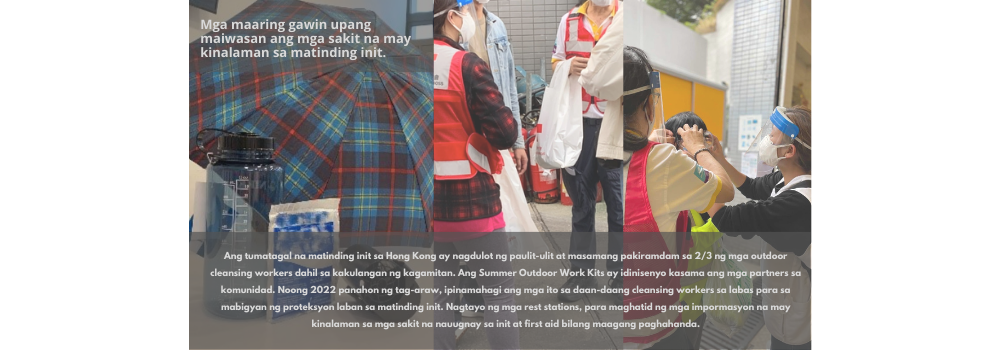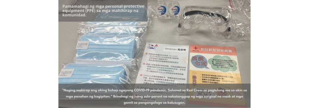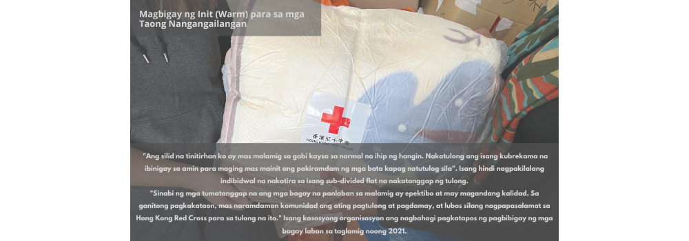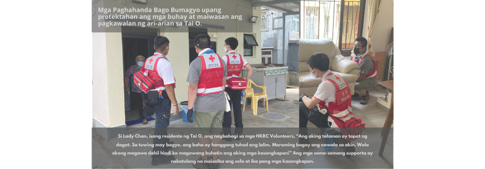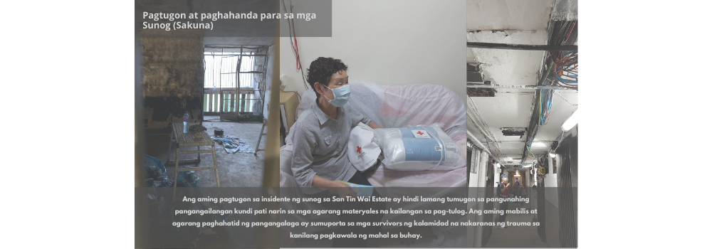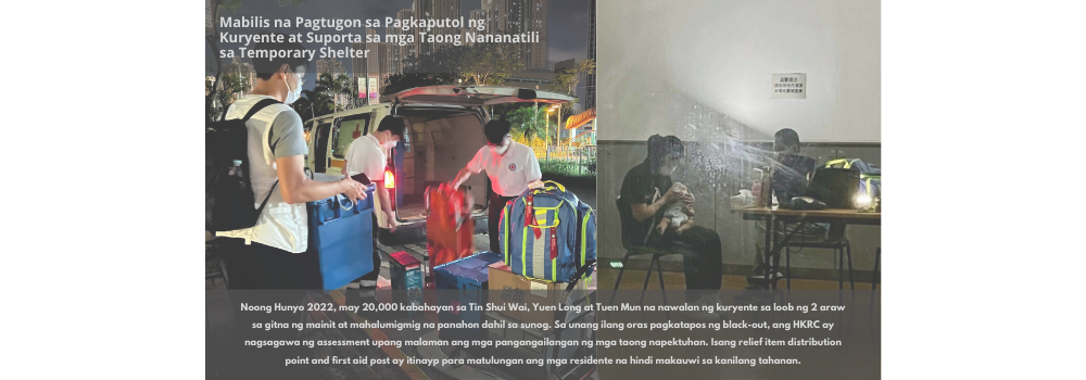 Ang Hong Kong Red Cross ay nag-iisang organisasyon na sumusuporta sa Kagawaran ng Panlipunang Kapakanan na magkaloob ng 24-oras na serbisyong pang-sakuna kagaya ng pagbibigay ng mga relief items para sa mga taong naapektuhan ng kalamidad o sakuna sa pamamagitan ng referral ng mga pampubliko o pribadong organisasyon. Damit, kumot, at pang-araw-araw na pangangailangan ay ang ilan lamang sa mga tulong o “relief” na maaring matanggap ng mga nangangailangan.